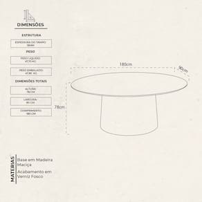 Tampo: Revestido com lâminas n Acabamento: Verniz Acabamento da Base: Verniz Acabamento do Tampo: Verniz Ambiente Principal: Sala de Jantar Atóxico: Sim codigo_ean: 7900288193490 Complexidade da Montagem: Baixa: pode ser montado por uma pessoa sozinha Cor: Mel Cor do Produto: Mel Design da Base: Cilindro Dobrável: Não Escala de Brilho: Fosco Espessura do Tampo: 18 mm Extensível: Não Itens Inclusos: 1 Mesa e Kit Ferragens Linha ou Coleção: Amanda Manual de Montagem e Instalação: https://product-hub-prd.madeiramadeira.com.br/547253097/documents/767139a1-a5f6-4894-a444-f9faf49452683069121491417525164761238.pdf Marca: Árvore de Minas Material da Base: Madeira Maciça Material do Tampo: MDF Material Principal: MDF Medida da Base (A x L x P): 76,20 x 90 x 45 Medida da Mesa (A x L x P): 78 x 90 x 180 Medida do Tampo (L x C x E): 90 x 180 x 1,8 Necessita Montagem: Sim Origem do Produto: Nacional Peso: 47,7 kg Possui Portas: Não Possui prateleira: Não Possui Rodízio: Não Possui Suporte Giratório: Não Possui Vidro: Não Recomendações de Uso, Manutenção e Limpeza: Utilizar pano umido, não utilizar liquidos abrasivos Sistema de Montagem: Fixação de Parafusos Suporta Até (kg): 140 kg Tipo de Madeira Maciça da Base: Tauari