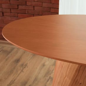 Fabricada com materiais de alta qualidade, sua estrutura em madeira maciça oferece firmeza e estabilidade, enquanto o tampo em lâmina natural de cinamomo, com acabamento em verniz fosco, garante durabilidade e charme natural à peça.
