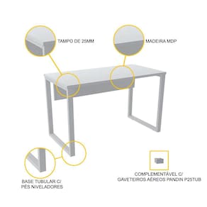 DETALHES DO PRODUTO- Mesa para escritório, com tampo em madeira (MDP) e base tubular, com pés niveladores.