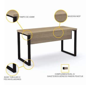 - Mesa para escritório com tampo em madeira (MDP) e base tubular, com pés niveladores.