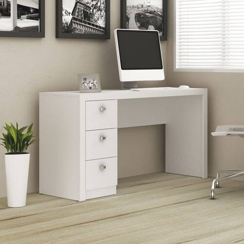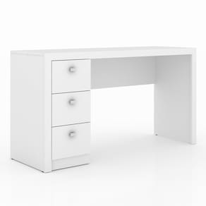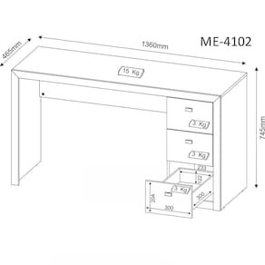 A escrivaninha ME-4102 da Tecno Mobili tem uma estrutura em MDP e revestimento em BP. Montagem reversível e costas na "cor" da móvel. Possui 3 gavetas com puxadores em PVC. Suporta até 15 kg no tampo e 3 kg nas gavetas. Sua montagem é feita através de cavilhas e minifix. Medidas do produto montado (A x L x P): 74,5 cm x 136,00 cm x 46,5 cm. Eletrônicos e demais objetos decorativos que aparecem na imagem não acompanham o kit.
