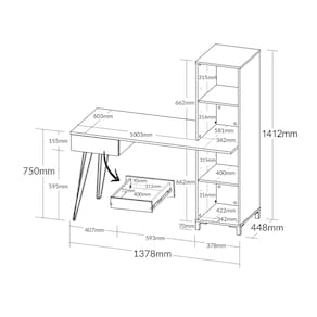 Ela é indicada para Escritórios, Salas de Estar ou Quartos. Ela possui tampo de 18mm com borda ABS de 2mm. Possui também uma gaveta com corrediça telescópica, duas prateleiras com regulagem de altura.