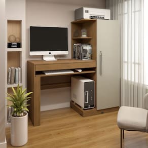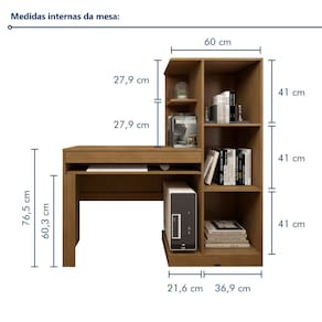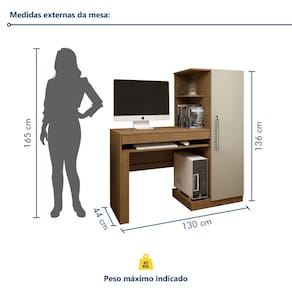 Estilo: Moderno Peso (kg): 41.6 Dobrável: Não Garantia: 03 Meses Altura (cm): 136 Descrição: A Mesa para Computador Escrivaninha com Armário é a solução perfeita para quem busca organização e praticidade no ambiente de trabalho ou estudo. Com um design moderno e funcional, oferece amplo espaço para o computador, livros e materiais, além de um armário que proporciona armazenamento extra. Ideal para quem precisa de modernização o espaço sem abrir mão da sofisticação. Sua estrutura é robusta e oferece excelente durabilidade, garantindo conforto e praticidade no seu dia a dia. A mesa oferece espaço para outros itens além do computador? Sim, ela possui amplo espaço para livros, documentos e outros materiais, garantindo organização. O armário é espaçoso? Sim, o armário oferece bom espaço para guardar objetos adicionais e manter o ambiente organizado. Acabamento: Pintura UV Largura (cm): 130 Possui Vidro: Não Possui Nichos: Sim Possui Portas: Sim Pés Reguláveis: Não Possui Gavetas: Sim Possui Rodízio: Não Suporta Até (kg): 61 Modelo Infantil: Não Possui Espelhos: Não Profundidade (cm): 44 Escala de Brilho: Fosco Gaveta com Chave: Não Ambiente Principal: Escritório Espessura do Tampo (mm): 15 Material Principal: MDP Necessita Montagem: Sim Possui Passa Cabos: Não Possui Prateleiras: Sim Sapatas Niveladoras: Não Possui Porta Objetos: Sim Peso Máximo por Gaveta: 5 Formato da Escrivaninha: Retangular Possui Suporte para CPU: Sim Complexidade da Montagem: Média: pode ser montado por mais de uma pessoa e/ou necessite de maior conhecimento para montagem Possui Borda Arredondada: Não Peso Máximo por Prateleira: 2 Pés com Regulagem de Altura: Não Possui Suporte para Teclado: Sim Tipo de Corrediça da Gaveta: Metálica Material do Puxador da Porta: Plástico Acompanha Manual de Instalação: Sim Possui Gaveta para Pasta Suspensa: Não Possui Acabamento na Parte de Trás: Não Recomendações de Uso, Manutenção e Limpeza: Utilizar pano umedecido. Não usar lustra móveis. Marca: Valdemóveis Montagem Flex: Não, só é possível a montagem do produto conforme imagem do anúncio. Cor do Produto: Cinamomo/Off White Itens Inclusos: 1 Mesa para Computador e Manual de Montagem. Linha ou Coleção: Office Sistema de Montagem: Parafusos