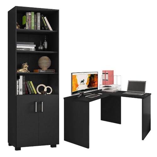 Mesa para Computador Gávea com Extensora e Livreiro Office com Portas Pequenas Preto Trama - Móveis Leão