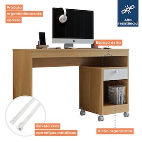 Caracteristicas: Acabamento: Pintura UV Material Principal: MDP Escala de Brilho: Fosco Estilo: Contemporaneo Formato: Retangular Possui Portas: Nao Rodizio com Trava: Nao Suporta Ate: 26 kg Possui Suporte para Teclado: Nao Possui Passa Cabos: Nao Possui Suporte para CPU: Sim Possui Porta Objetos: Sim Possui Prateleiras: 01 Material da Prateleira: MDP Acabamento da Prateleira: Pintura Escala de Brilho da Prateleira: Fosco Peso Maximo por Prateleira: 1 Possui Gavetas: 01 Acabamento da Gaveta: Pintura UV Escala de Brilho da Gaveta: Fosco Gaveta com Chave: Nao Tipo de Corredica da Gaveta: Metalica Simples Tipo de Puxador da Gaveta: Externo Material da Gaveta: MDP Peso Maximo por Gaveta: 2 Material do Puxador da Gaveta: ABS Sapatas Niveladoras: Nao Necessita Montagem: Sim Sistema de Montagem: Parafusos e Cavilhas Complexidade da Montagem: Media: pode ser montado por mais de uma pessoa e/ou necessite de maior conhecimento para montagem Recomendacoes de Uso, Manutencao e Limpeza: Recomendamos que a limpeza seja feita apenas com pano umedecido.