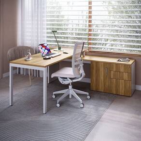 Mesa com Balcão Lateral, ideal para otimizar e organizar o espaço de trabalho. Pode ser montada em ambos os lados e usada como divisor de ambientes. Perfeita para escritórios e home offices, combina com móveis de estilo moderno e funcional.