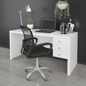 Mesa Escritório Tecnomobili ME4113, possui 3 gavetas que são espaçosas para armazenar documento e/ou objetos, sua montagem pode ser reversível, material em MDP, acabamento em BP, costas na cor do móvel.
