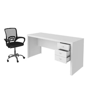 A cadeira tem estrutura em poliuretano de altíssima qualidade, que proporciona muito mais resistência, mesmo com o passar dos anos. O acabamento em verniz deixa o móvel mais bonito e dá mais destaque a decoração de toda a casa. Essa cadeira tem design versátil, assento confortável e vem com kit de montagem, para tudo ficar mais rápido e prático. Ela suporta até 120 kg de peso máximo, que dá mais tranquilidade ao sentar e tem 4 pés com rodízios em PU que não arranham o piso do cômodo. Acabamento: BP Altura do Conjunto: 85 cm Ambiente: Escritório Ambiente Principal: Escritório Cor: Branco Informação Complementar: 1x Mesa para Escritório com 3 Gavetas Me4113 Branca Largura: 155 cm Altura: 74,5 cm Peso: 33,5 kg Profundidade: 60 cm Necessita Montagem: Sim
