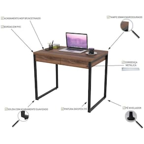 A Mesa Office KUME692 tem montagem simples e versátil, conta com 02 gavetas embutidas e pode ser utilizada em diversas composições com outros móveis. A Linha Kuadra tem seu design com inspiração no estilo industrial, que remete muito a decoração usada nos Lofts das grandes metrópoles nos anos 60 e 70. Harmonizando o metal e os tons de madeira, foram projetados móveis versáteis e com estilo, que podem compor ambientes flexíveis cheios de personalidade, perfeitos para você decorar sua casa ou seu trabalho, tendo um resultado que caminha do estilo rústico ao moderno. Pés com 30x20mm de espessura. Produto Montado: Sim Acabamento da Gaveta: BP Acabamento do Tampo: BP Acabamento dos Pés: Pintura Acompanha Manual de Instalação: Sim Ambiente Principal: Escritório codigo_ean: 7908167262886 Complexidade da Montagem: Média: pode ser montado por mais de uma pessoa e/ou necessite de maior conhecimento para montagem Cor: Nogal Cor do Produto: Nogal Cor do Tampo: Marrom Cor Interna: Nogal Dobrável: Não Escala de Brilho: Fosco Escala de Brilho da Gaveta: Fosco Espessura do Tampo: 30 mm Formato: Retangular Gaveta com Chave: Não Itens Inclusos: Escrivaninha, Kit Ferragens e Manual de Montagem Linha ou Coleção: Kuadra Manual de Montagem e Instalação: https://product-hub-prd.madeiramadeira.com.br/MESA%20KUADRA.pdf/documents/MESA%20KUADRA.pdf Material da Gaveta: MDP Material dos Pés: Aço Material Principal: MDP Montagem Flex: Sim, mesa simétrica Necessita Montagem: Sim Origem do Produto: Nacional Peso: 18,05 kg Possui Passa Cabos: Não Possui Pés: 02 Possui Porta Objetos: Não Possui Portas: Não Possui Prateleiras: Não Possui suporte para CPU: Não Possui Suporte para Teclado: Não Quantidade de Gavetas: 02 Gavetas Recomendações de Uso, Manutenção e Limpeza: Para a limpeza, utilize flanela seca ou pano macio levemente umedecido em água. Utilize um pano seco em seguida. Evite contato com produtos químicos (solventes, thinner, acetona, etc) e não utilize nenhum tipo de esponja de aço. Sapatas Niveladoras: Sim Sistema de Montagem: Parafusos e buchas Suporta Até (kg): 40 kg Tipo de Puxador da Gaveta: Embutido Ean: 7908167262886