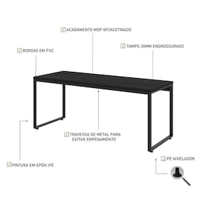 A linha Kuadra tem seu design com inspiração no estilo industrial, que remete muito a decoração usada nos lofts das grandes metrópoles nos anos 60 e 70. Harmonizando o metal e os tons de madeira, foram projetados móveis versáteis e com estilo, que podem compor ambientes flexíveis cheios de personalidade, perfeitos para você decorar sua casa ou seu trabalho, tendo um resultado que caminha do estilo rústico ao moderno. Suas estruturas são fabricadas em aço, espessura dos pés de 30x20mm, com soldas suavizadas e pintura texturizada epóxi-pó, conta com pés niveladores de altura e parafusos na cor preta. Para os tampos são utilizados mdp-bp acetinado com fitas de borda em pvc, dando uma maior durabilidade ao seu móvel. A Mesa KUME135 tem montagem simples e versátil, podendo ser utilizado em diversas composições com outros móveis, sendo perfeita para fazer parte do seu escritório ou sala. Produto Montado: Sim Acabamento do Tampo: BP Acabamento dos Pés: Pintura Acompanha Manual de Instalação: Sim Ambiente Principal: Escritório codigo_ean: 7893640271441 Complexidade da Montagem: Média: pode ser montado por mais de uma pessoa e/ou necessite de maior conhecimento para montagem Cor: Preto Onix Cor da Base: Preto Cor do Produto: Preto Ônix Cor do Tampo: Preto Cor Interna: Preto Ônix - A mesa é lisa, sem textura. Dobrável: Não Escala de Brilho: Fosco Espessura do Tampo: 30 mm Formato: Retangular Gaveta com Chave: Não Itens Inclusos: Escrivaninha, Kit Ferragens e Manual de Montagem Linha ou Coleção: Kuadra Manual de Montagem e Instalação: https://product-hub-prd.madeiramadeira.com.br/704801/documents/fc9478b6-9395-4ebb-805f-daef15f8f972860940manualmesakuadra180.pdf Marca: Compace Material dos Pés: Aço Material Principal: MDP Modelo Infantil: Não Montagem Flex: Sim, mesa simétrica Necessita Montagem: Sim Origem do Produto: Nacional Peso: 24,83 kg Possui Acabamento na Parte de Trás: Sim Possui Borda Arredondada: Não Possui Espelhos: Não Possui Gaveta para Pasta Suspensa: Não Possui Passa Cabos: Não Possui Pés: 02 Possui Porta Objetos: Não Possui Portas: Não Possui Prateleiras: Não Possui suporte para CPU: Não Possui Suporte para Teclado: Não Recomendações de Uso, Manutenção e Limpeza: Para a limpeza, utilize flanela seca ou pano macio levemente umedecido em água. Utilize um pano seco em seguida. Evite contato com produtos químicos (solventes, thinner, acetona, etc) e não utilize nenhum tipo de esponja de aço. Sapatas Niveladoras: Sim Sistema de Montagem: Parafusos e buchas Suporta Até (kg): 40 kg Suporta Braço Articulado: Sim, somente de furação