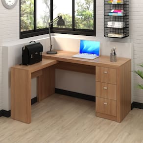 CARACTERÍSTICAS TÉCNICAS: - Fabricada em MDP, com acabamento BP e costas na cor amêndoa, garantindo durabilidade e um acabamento perfeito; - 3 Gavetas para organização de documentos e objetos, com amplo espaço para manter seu ambiente de trabalho sempre organizado; - Mesa de Apoio Lateral inclusa, garantindo mais funcionalidade e ampliando a superfície útil para o seu dia a dia; - Montagem reversível: Pode ser montada tanto para o lado esquerdo quanto para o lado direito, adaptando-se ao seu espaço e necessidades; - Produto entregue desmontado, novo, com manual de montagem e ferragens inclusos.