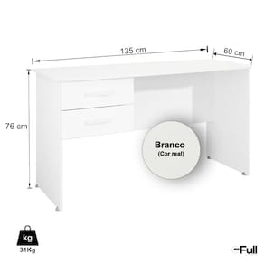 Com dimensões de 1,35m de largura, 0,76m de altura e 0,60m de profundidade, a mesa secretária oferece duas gavetas espaçosas com corrediças metálicas, perfeitas para armazenar documentos, material de escritório e outros itens essenciais. O amplo tampo fornece espaço suficiente para seu computador, laptop e outros materiais de trabalho.