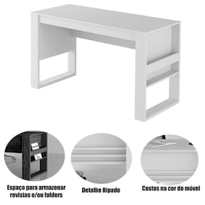 Características da Mesa para Escritório Escrivaninha Detalhe Ripado: - Estrutura em MDP; - Acabamento em BP; - Possui espaço para armazenar revistas e/ou folders; - Costas na cor do móvel; - Suporta até 15kg no tampo; - Não acompanha objetos decorativos; - Para uma limpeza mais efetiva, utilizar apenas pano macio umedecido e sabão neutro. Não utilizar produtos abrasivos; - Montagem por conta do comprador;