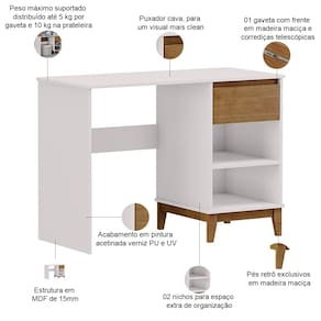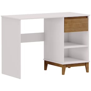 Com um design linear e contemporâneo, essa escrivaninha une funcionalidade e elegância em proporções ideais. A gaveta espaçosa oferece armazenamento discreto para materiais de escritório, enquanto os dois nichos abertos são ideais para livros, pastas ou itens de uso frequente. Para completar, os pés em madeira maciça adicionam um toque de calor natural ao conjunto, criando um equilíbrio harmonioso entre modernidade e aconchego.