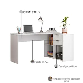 Possui duas gavetas com corrediças metálicas, ótimo espaço interno para guardar papéis ou objetos de sua preferência, nichos onde você pode dispor livros, algumas decorações e colocar pastas com documentos que precisam sempre estar à mão.