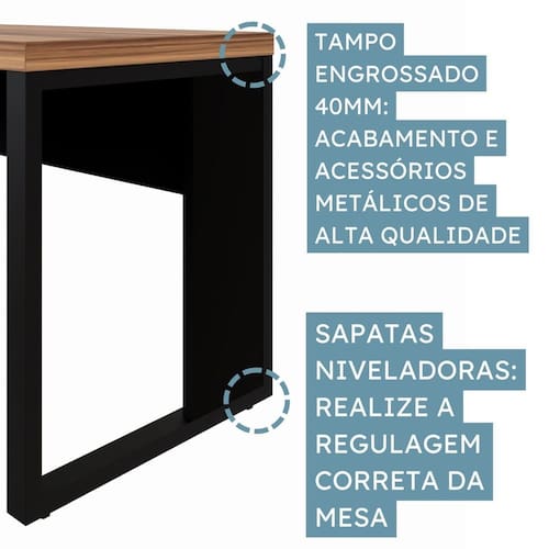 relativa do ar e/ ou dos substratos inicia a sua reticulação, tornando-se u Acabamento do Tampo: BP Acompanha Manual de Instalação: Sim Ambiente Principal: Escritório Complexidade da Montagem: Baixa: pode ser montado por uma pessoa sozinha Cor: Preto/Marrom Cor da Base: Preto Cor do Produto: Preto/Marrom Cor do Tampo: Marrom Dobrável: Não Espessura do Tampo: 40 mm Formato: Retangular Manual de Montagem e Instalação: https://product-hub-prd.madeiramadeira.com.br/901508/documents/a420509b-ec20-4f04-91c1-2803bc3d01831879752sat1261.pdf Material Principal: MDP Necessita Montagem: Sim Origem do Produto: Nacional Pés com Regulagem de Altura: Não Pés Reguláveis: Não Peso: 24,3 kg Possui Painel: Não Possui Passa Cabos: Não Possui Porta Objetos: Não Possui Portas: Não Possui Prateleiras: Não Possui suporte para CPU: Não Possui Suporte para Teclado: Não Possui Vidro: Não Recomendações de Uso, Manutenção e Limpeza: Antes de limpar recomenda-se que seja retirada toda a poeira com um espanador ou flanela seca para evitar riscos na superfície, após utilize um pano umido em água, macio e limpo. Sapatas Niveladoras: Sim Sistema de Montagem: parafusos e cavilhas Suporta Até (kg): 25 kg