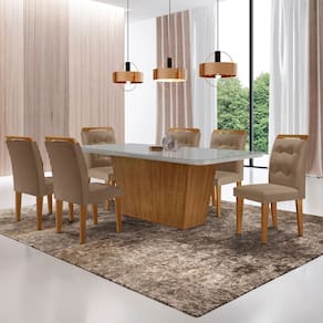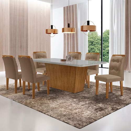 Com um design sofisticado e contemporâneo, a Sala de Jantar Aida com as Cadeiras Carol é a escolha perfeita para elevar qualquer ambiente. Produzido em MDF, este conjunto combina elegância e funcionalidade. As Cadeiras, com assento e encostos estofados, são enriquecidas com detalhes em botões no encosto, conferindo um charme refinado e clássico. A mesa destaca-se pela base robusta e linhas retas, com um acabamento impecável que completa o visual moderno e sofisticado. Transforme seu espaço com a sala de jantar Aida e adicione um toque de classe ao seu dia a dia