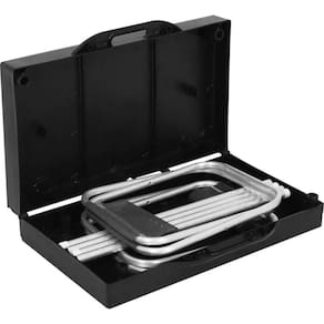 Mesa dobrável que vira uma maleta para transportar e guardar as banquetas.