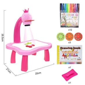 Este produto é projetado para ajudar no desenvolvimento da coordenação motora, percepção tátil e visual e reconhecimento de cores e luzes em crianças. O conjunto inclui uma mesa com suporte para projetor, um projetor que deve ser acoplado na parte superior da mesa, seis slides de projeção, 24 desenhos diferentes e 12 canetas de pintura. O projetor funciona com pilhas AA (não inclusas).
