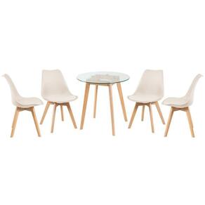 Cadeira Leda: Material do encosto: Polipropileno - Material do assento: Couro PU - Material dos pés: Madeira natural - Altura do encosto: 82 cm - Altura do assento: 44 cm - Largura do assento: 48 cm - Profundidade do assento: 43 cm - Distância entre os pés: 42 cm - Peso suportado: 130 kg. Mesa redonda Leda: Material do tampo: Vidro incolor temperado 8 mm - Material da base: Madeira natural - Altura: 70 cm - Diâmetro do tampo: 70 cm - Garantia: 3 meses.