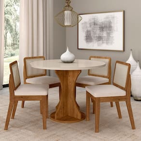 A Mesa Redonda Cali com 4 Cadeiras Sydney Sextavadas, trás Elegância e Conforto para sua Sala de Jantar as cadeiras são confortáveis para longas conversas e bons momentos em família.