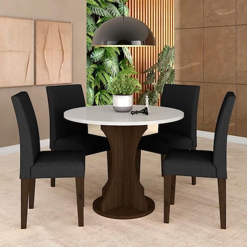 Detalhes Técnicos da Mesa: -Acabamento da Mesa: Pintura Texturizada - Tipo de Pintura: UV Texturizada - P.U - Borda da Mesa: P.U - Quantidade de Lugares: 04 - Material da Base da Mesa: MDF 25mm - Material do Tampo: MDF - Espessura do Tampo: 25 mm - Possui Tampo de Vidro: Não - Tonalidade do Tampo: Off White -Tonalidade da base da mesa: Imbuia - Medida da Mesa Montada: A:80CM x L:90CM x P:90CM - Possui Suporte Giratório: Não - Formato: Redondo