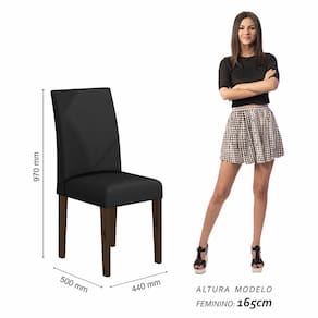 Detalhes Técnicos das Cadeiras: - Acabamento da Cadeira: Pintura com Assento e Encosto Tapeçados - Almofada do Assento: Fixa - Cadeira Estofada: Sim - Peso Suportado da Cadeira: 90 KG - Facilidade da Montagem: Média - Tonalidade da estrutura da Cadeira: Imbuia - Tonalidade do Tecido: Suede Preto - Espuma do Assento: D 23 - Espuma do Encosto: D 16 - Tipo de Pintura: UV Texturizada - Material da Estrutura: 100% MDF 25 e 18 mm - Medida da Cadeira/ Banco: 97CM x 44CM x 50CM