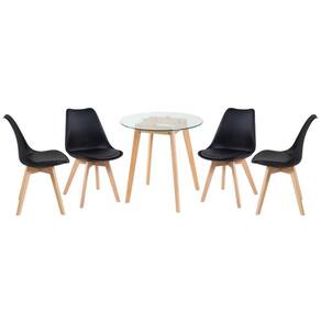 Cadeira Leda: Material do encosto: Polipropileno - Material do assento: Couro PU - Material dos pés: Madeira natural - Altura do encosto: 82 cm - Altura do assento: 44 cm - Largura do assento: 48 cm - Profundidade do assento: 43 cm - Distância entre os pés: 42 cm - Peso suportado: 130 kg. Mesa redonda Leda: Material do tampo: Vidro incolor temperado 8 mm - Material da base: Madeira natural - Altura: 70 cm - Diâmetro do tampo: 70 cm - Garantia: 3 meses.