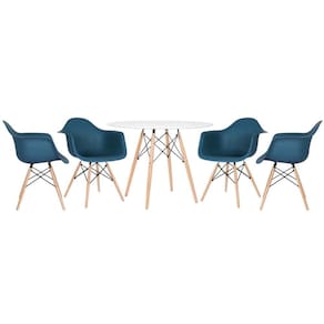 Cadeira modelo Eames DAW: Material do assento: Polipropileno - Material da base: Madeira e aço - Altura do encosto: 78 cm - Altura do assento: 45 cm - Altura do apoio de braços: 65 cm - Largura do assento: 40 cm - Profundidade do assento: 45 cm - Distância entre os pés: 45 cm - Peso suportado: 130 kg. Mesa redonda Eames: Material do tampo: MDF laqueado (Laca fosca) - Material da base: Madeira e aço - Diâmetro do tampo: 100 cm - Altura: 75 cm - Garantia: 3 meses.