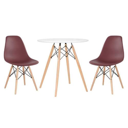 CADEIRAS: Material do assento: Polipropileno - Material da base: Madeira e aço - Altura do encosto: 81 cm - Altura do assento: 43 cm - Largura do assento: 46 cm - Profundidade do assento: 40 cm - Distância entre os pés: 40 cm - Peso suportado: 130 kg. MESA: Material do tampo: MDF laqueado (Laca fosca) - Material da base: Madeira e aço - Altura: 75 cm - Diâmetro: 70 cm.