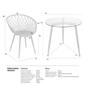 Quantidade de lugares: 3 | Altura do assento (cadeiras): 45 cm | Largura do assento (cadeiras): 35 cm | Comprimento do assento (cadeiras): 43 cm | Material do assento (cadeiras): Polipropileno | Material da base (cadeiras): Metal com pintura epóxi texturizada | Peso suportado (cadeiras): 130 kg | Material do tampo (mesa): Vindro incolor temperado 8 mm | Material dos pés (mesa): Metal com pintura epóxi texturizada | Diâmetro (mesa): 80 cm | Altura (mesa): 75 cm | Altura: 75 cm | Largura: 80 cm | Fabricante: Mobili | RBN: 17100657011 | Cor: Multicolorido | Garantia do fabricante: 3 meses | Peso do produto: 10 kg | Produto: Conjunto de Mesa e Cadeiras Cor: Fendi