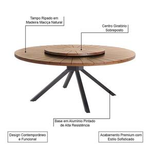 A Mesa Redonda Tetra é a união perfeita entre funcionalidade, elegância e robustez. Seu tampo ripado em madeira maciça natural destaca-se pelo acabamento refinado e presença marcante. No centro, o tampo giratório facilita a disposição dos itens sobre a mesa, trazendo praticidade às refeições. A base, com estrutura em alumínio pintado na cor preta, garante resistência, estabilidade e um toque contemporâneo ao conjunto. Uma escolha ideal para espaços que valorizam o design e a convivência.