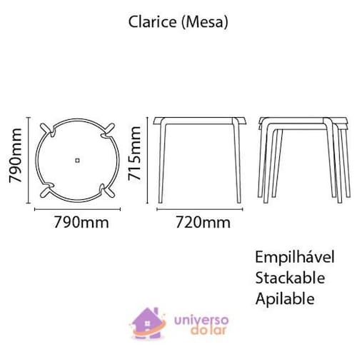Mesa Redonda Tramontina Clarice Branca em Polipropileno e Fibra de Vidro Com o charme e a praticidade das mesas Tramontina, tudo fica mais moderno! A Mesa Redonda Tramontina Clarice Branca em Polipropileno e Fibra de Vidro, deveria rimar com inovação, pois foi essa mesa que inovou o segmento de móveis plásticos quando designou a estudantes de diversas faculdades seu projeto, o qual usou tecnologia de injeção assistida a gás. Evitar longa exposição ao sol. Com design diferenciado, produzida com tecnologia de ponta, alta qualidade e submetida a rigorosos testes de qualidade, ela vai conquistar você. .