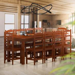 Este conjunto de mesa com cadeiras apresenta uma mesa robusta com estrutura e pés em madeira maciça, combinada com um tampo em MDP. As cadeiras são feitas de 100% madeira maciça, entregues montadas para maior comodidade, e cada uma suporta até 150kg. O design clássico e resistente torna-o ideal para diversas configurações de refeições.