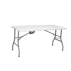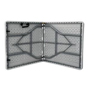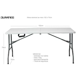 Especificações- Nome: Mesa Retangular dobrável ao meio 152 x 70 cm - Marca: Duratec - Código: MRDM152 - Tampo: 152 cm x 70 cm - Altura: 74 cm - Peso: 10 Kg - Tamanho dobrada : 77 x 8 x 70 cm - Cor: Branca / cinza - Garantia: 1 ano contra defeitos de fabricação Ean: 7898656530506