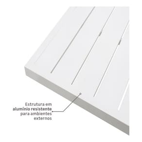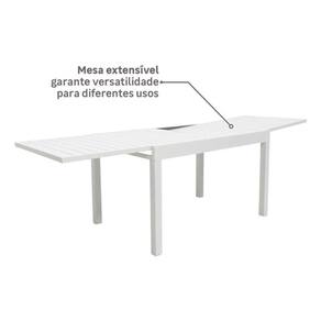 Resumo das Caracteristicas: Mesa extensivel retangular para jardim. Tonalidade branca. Acomoda ate 10 pessoas. Altura: 75cm. Largura: 90cm. Comprimento: varia de 135cm (sem extensao) a 270cm (com extensao). Material: Aluminio. Nao e dobravel. Nao possui furo para ombrelone. Estilo contemporaneo. Nao e giratoria. Nao e empilhavel. Indicada para areas externas com cobertura. Resistente a areas molhadas. Entregue desmontado. Garantia do fabricante de 36 meses. Imagem meramente ilustrativa. Marca: Não Informado Ean: 3276007268065