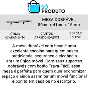 Dimensões: 80 x 41 cm Espessura: 15 mm A mesa dobrável com base é um móvel altamente prático e versátil, ideal para ambientes com pouco espaço. Produzida com mdp de reflorestamento, essa mesa é um exemplo de móvel sustentável que não agride o meio ambiente. Além disso, ela é revestida com melamina bp, um material altamente resistente a riscos e manchas, o que garante sua durabilidade ao longo do tempo. As bordas de pvc dão à mesa uma resistência extra, além de proporcionar um acabamento perfeito e elegante. Essa mesa é uma excelente escolha para quem busca um móvel funcional e seguro, pois seus suportes dobráveis possuem um botão trava-fácil, que impede que a mesa se desdobre acidentalmente, evitando possíveis acidentes. Com cantos arredondados, essa mesa é segura tanto para crianças quanto para adultos, pois evita que eles se machuquem ao esbarrar na mesa. Além disso, ela é compacta e pode ser facilmente guardada quando não estiver em uso, economizando espaço em sua casa ou escritório. Com seu estilo moderno e elegante, a mesa dobrável com base é uma excelente escolha para quem busca praticidade e design em um único móvel. Ela é perfeita para ser Utilizado como mesa de apoio em diferentes ambientes, como sala de estar, quarto, escritório, entre outros. Seu kit de fixação acompanha a mesa, garantindo que ela fique bem presa e estável no local onde for utilizada. Em resumo, a mesa dobrável com base é uma excelente escolha para quem busca praticidade, segurança e elegância em um único móvel. Com seus suportes dobráveis com botão trava-fácil, cantos arredondados e design moderno, essa mesa é perfeita para quem quer economizar espaço e ainda assim ter um móvel funcional e bonito em casa ou no escritório. As imagens são meramente ilustrativas