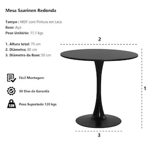 Mesa Saarinen Tulipa Redonda 120Cm Tampo Madeira Preto Sala Cozinha Jantar Modelo: Mesa Saarinen Tulipa Redonda 120cm Tampo Madeira Tampo: MDF com Pintura em Laca Base: Aço Diâmetro: 120 cm Diâmetro da Base: 65 cm Altura Total: 75 cm Quantidade por caixa: 1 Peso Unitário: 20 kgs Medida Embalagem Profundidade: 18 cm Largura: 127 cm Altura: 127 cm Marca: Não Informado