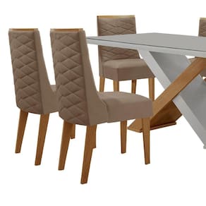 A sutileza define perfeitamente a Sala de Jantar Carol com Cadeiras Safira. Produzida em MDF, este conjunto e a simbolo do design moderno e elegante. As Cadeiras Safira oferecem um conforto excepcional com seus assentos e encostos estofados, alem de detalhes com bordados tanto na frente quanto atras do encosto, que realcam a sofisticacao do movel. A mesa, com sua base entrecruzada em dois, destaca-se pelo aspecto contemporaneo e inovador, prometendo encantar seus convidados e transformar suas refeicoes em ocasioes memoraveis e cheias de estilo.