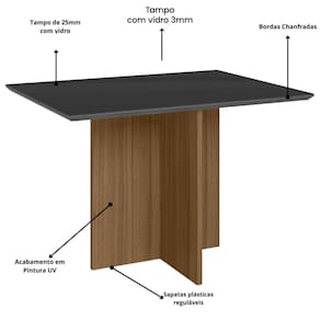 Material do tampo: MDP de 25 mm e vidro de 3 mm;