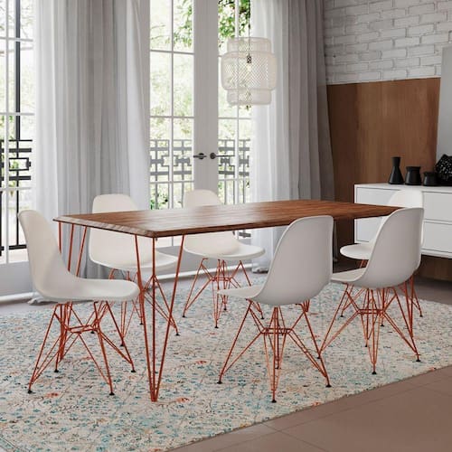 Mesa Sala De Jantar Industrial Clips Amêndoa 135x75 6 Cadeiras Eiffel Bracas De Ferro CobreO Jogo de Mesa 6 Cadeiras Eames Clips se destaca pelo design moderno e sofisticado. A Cadeira Eames Eiffel é confeccionada em polipropileno, sua base é em ferro, o que confere total resistência e conforto. O Jogo de Mesa 6 Cadeiras Eames Clips da vida ao ambiente além de combinar com todos os tipos e cores de móveis.CARACTERISTICAS CADEIRATipo: CadeiraModelo: EiffelCor: AmendoaBase: Ferro na cor CobreDIMENSÕES DO PRODUTOAltura: 85 cmLargura: 47 cmProfundidade: 50 cmAssento x Chão: 45 cmContém: 06 cadeirasCARACTERISTICAS MESATipo: MesaModelo: ClipsCor: BrancoBase: Ferro na cor CobreDIMENSÕES DO PRODUTOAltura: 76cmLargura: 135cmProfundidade: 75cmObs: Imagens Meramente IlustrativaMesa Sala de Jantar Industrial Clips AmÃndoa 135x75 6 Cadeiras Eiffel Bracas de Ferro Cobre