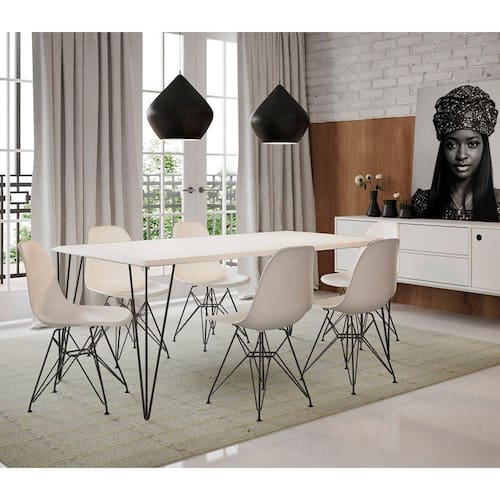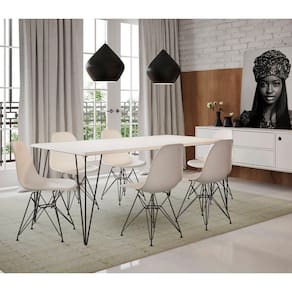 Mesa Sala De Jantar Industrial Clips Branca 135x75 Com 6 Cadeiras Eiffel Brancas De Ferro PretoO Jogo de Mesa 6 Cadeiras Eames Clips se destaca pelo design moderno e sofisticado. A Cadeira Eames Eiffel é confeccionada em polipropileno, sua base é em ferro, o que confere total resistência e conforto. O Jogo de Mesa 6 Cadeiras Eames Clips da vida ao ambiente além de combinar com todos os tipos e cores de móveis.CARACTERISTICAS CADEIRATipo: CadeiraModelo: EiffelCor: BrancoBase: Ferro na cor Preta DIMENSÕES DO PRODUTOAltura: 85 cmLargura: 47 cmProfundidade: 50 cmAssento x Chão: 45 cmContém: 06 cadeirasCARACTERISTICAS MESATipo: MesaModelo: ClipsCor: PretoBase: Ferro na cor PretaDIMENSÕES DO PRODUTOAltura: 76cmLargura: 135cmProfundidade: 75cmObs: Imagens Meramente Ilustrativa