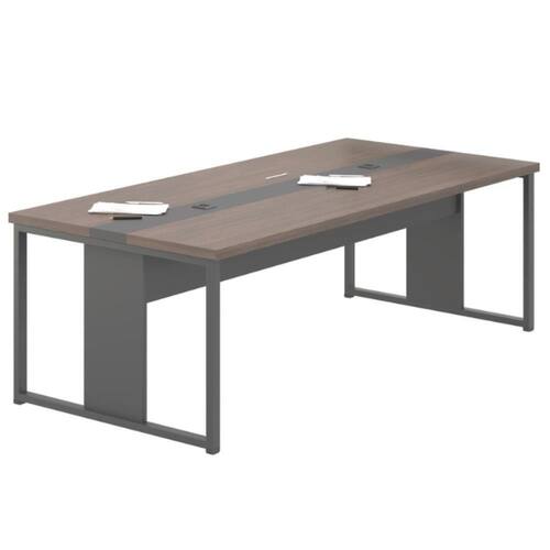 Caixas de tomodas de energia e USB acima do tampo 40mm, compartilhamento central abaixo do tampo para conexões e passagem de fios e cabos de energia. Pés em aço 50x30 e contém uma linha no meio na cor Preto.