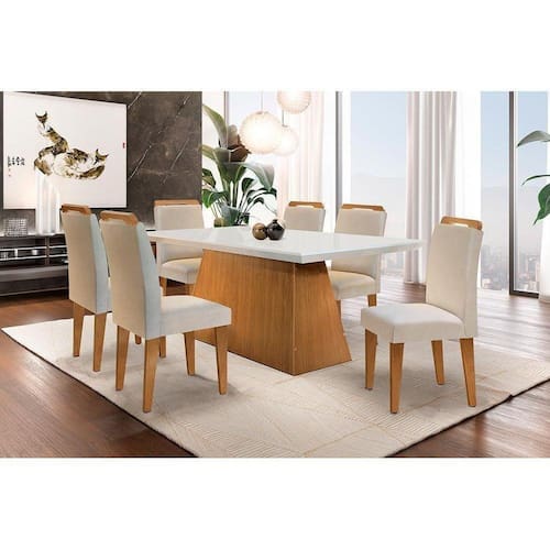 Abaixo segue os produtos do KIT: Conjunto: Mesa Sala Jantar Luna c/ Tampo Madeirado c/ Vidro Canto Reto 180cm + 6 Cadeiras Athenas Capuccino/Veludo Creme - Rufato