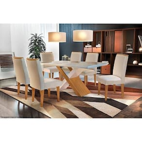 Sala de Jantar Completa Imperatriz c/ Tampo Madeirado c/ Vidro Canto Reto 180cm + 6 Cadeiras Lunara Imbuia/OW/Creme - Rufato