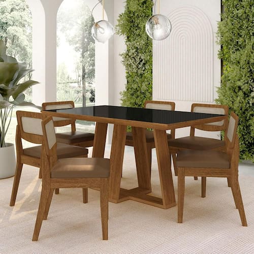 Detalhes Técnicos das Cadeiras -Assento Tapeçados, Estofados e Fixos -Encosto Tela sintética -Peso Suportado da Cadeira:90KG -Facilidade da Montagem:Média -Tonalidade da Cadeira:Freijó/Corino Caramelo -Espuma do Assento:D16 -Tipo de Pintura:UV Texturizada -Material da Estrutura:MDF 25/18mm -Medida da Cadeira:84CMx45CMx53CM