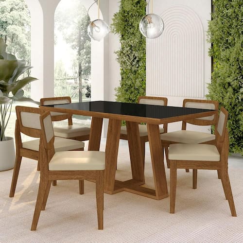 Detalhes Técnicos das Cadeiras -Assento Tapeçados, Estofados e Fixos -Encosto Tela sintética -Peso Suportado da Cadeira:90KG -Facilidade da Montagem:Média -Tonalidade da Cadeira:Freijó/Corino Bege -Espuma do Assento:D16 -Tipo de Pintura:UV Texturizada -Material da Estrutura:MDF 25/18mm -Medida da Cadeira:84CMx45CMx53CM