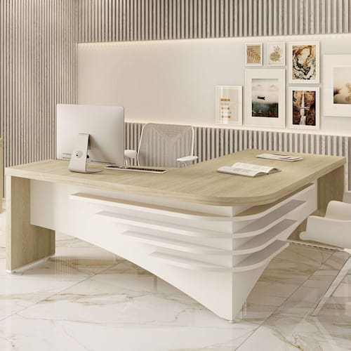 O(a) Mesa Tamburato Diretor Ii Ld Carvalho/Branco - Artany Móveis é produzido em Tamburato na escala de brilho Fosco, e possui um grau de dificuldade de montagem: Médio.