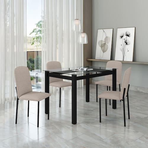 Sua estrutura é de tubo em aço, com pintura Epóxi de alta resistência, tampo da mesa de Vidro Temperado, o que proporciona um design moderno ao produto, cadeiras com assento confortável e encosto anatômico proporcionando conforto. Acompanha cadeira. Medida da Mesa (A x L x P): 76,5cm x 120cm x 80cm Peso da Mesa: 20,035 kg Mesa suporta até: 40 kg Acabamento da Cadeira/Banco: Pintura Epóxi Acabamento da Mesa: Pintura Epóxi Acompanha Manual de Instalação: Sim Almofada do assento: Fixa Ambiente Principal: Sala de Jantar Cadeira/Banco Estofada: Encosto e Assento Estofados Cadeira/Banco estofada: Encosto e Assento Estofados Cadeira/Banco suporta até: 120 kg Cadeira/Banco Suporta Até: 120.0000 codigo_ean: 7898644079307 Complexidade da Montagem: Média: pode ser montado por mais de uma pessoa e/ou necessite de maior conhecimento para montagem Cor: Preto / Bege Cor da Base: Preto Cor das Cadeiras: Preto Cor do Produto: Preto / Bege Cor do Tampo: Transparente Cor Secundária: Cinza De Canto (Canto Alemão): Não Design da Base: Retangular Enchimento do Assento: Espuma D-18 Escala de Brilho: Semi-Fosco Espessura do Tampo: 6 mm Espessura do Vidro: 6 mm Estrutura do Assento: Aço Formato do Tampo: Retangular Itens Inclusos: 1 Mesa, 4 Cadeiras, Kit Ferragens e Manual de Montagem Linha ou Coleção: Tokio / Classic Manual de Montagem e Instalação: https://product-hub-prd.madeiramadeira.com.br/354203654/documents/c54a4f94-2593-4cb3-a2d2-d423e42e4ec83136141531017551876434792.pdf Marca: Art Panta Material da Base da Mesa: Aço Material da Estrutura da Cadeira: Aço Material do Tampo: Vidro Material Principal: Aço Medida da Cadeira/Banco (A x L x P): 86cm x 42cm x 52cm Medida do Tampo (L x C x E): 80cm x 120cm x 6mm Mesa Dobrável: Não Mesa Extensível: Não Montagem Flex: Não Necessita Montagem: Sim Origem do Produto: Nacional Peso da Cadeira/Banco: 9,69 kg Possui Apoio para Braços: Não Possui Apoio Para os Pés: Não Possui Prateleiras: Não Possui Suporte Giratório: Não Possui Vidro: Não Quantidade de Cadeiras: 4 Quantidade de Lugares: 04 Recomendações de Uso, Manutenção e Limpeza: Pano levemente umedecido com água, seguido de pano seco, não utilizar produtos químicos ou abrasivos. Revestimento da Cadeira/Banco: Linho Sistema de Montagem: Parafusos Vidro Temperado: Sim