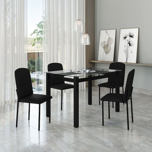 Sua estrutura é de tubo em aço, com pintura Epóxi de alta resistência, tampo da mesa de Vidro Temperado, o que proporciona um design moderno ao produto, cadeiras com assento confortável e encosto anatômico proporcionando conforto. Acompanha cadeira. Medida da Mesa (A x L x P): 76,5cm x 120cm x 80cm Peso da Mesa: 20,035 kg Mesa suporta até: 40 kg Acabamento da Cadeira/Banco: Pintura Epóxi Acabamento da Mesa: Pintura Epóxi Acompanha Manual de Instalação: Sim Almofada do assento: Fixa Ambiente Principal: Sala de Jantar Cadeira/Banco Estofada: Encosto e Assento Estofados Cadeira/Banco estofada: Encosto e Assento Estofados Cadeira/Banco suporta até: 120 kg Cadeira/Banco Suporta Até: 120.0000 codigo_ean: 7898644079314 Complexidade da Montagem: Média: pode ser montado por mais de uma pessoa e/ou necessite de maior conhecimento para montagem Cor: Preto Cor da Base: Preto Cor das Cadeiras: Preto Cor do Produto: Preto Cor do Tampo: Transparente Cor Secundária: Cinza De Canto (Canto Alemão): Não Design da Base: Retangular Enchimento do Assento: Espuma D-18 Escala de Brilho: Semi-Fosco Espessura do Tampo: 6 mm Espessura do Vidro: 6 mm Estrutura do Assento: Aço Formato do Tampo: Retangular Itens Inclusos: 1 Mesa, 4 Cadeiras, Kit Ferragens e Manual de Montagem Linha ou Coleção: Tokio / Classic Manual de Montagem e Instalação: https://product-hub-prd.madeiramadeira.com.br/800616529/documents/e5fcbbe7-0600-462c-8db4-781aac8b11e13136141531017551876434792.pdf Marca: Art Panta Material da Base da Mesa: Aço Material da Estrutura da Cadeira: Aço Material do Tampo: Vidro Material Principal: Aço Medida da Cadeira/Banco (A x L x P): 86cm x 52cm x 42cm Medida do Tampo (L x C x E): 80cm x 120cm x 6mm Mesa Dobrável: Não Mesa Extensível: Não Montagem Flex: Não Necessita Montagem: Sim Origem do Produto: Nacional Peso da Cadeira/Banco: 9,69 kg Possui Apoio para Braços: Não Possui Apoio Para os Pés: Não Possui Prateleiras: Não Possui Suporte Giratório: Não Possui Vidro: Não Quantidade de Cadeiras: 4 Quantidade de Lugares: 04 Recomendações de Uso, Manutenção e Limpeza: Pano levemente umedecido com água, seguido de pano seco, não utilizar produtos químicos ou abrasivos. Revestimento da Cadeira/Banco: Linho Sistema de Montagem: Parafusos Vidro Temperado: Sim